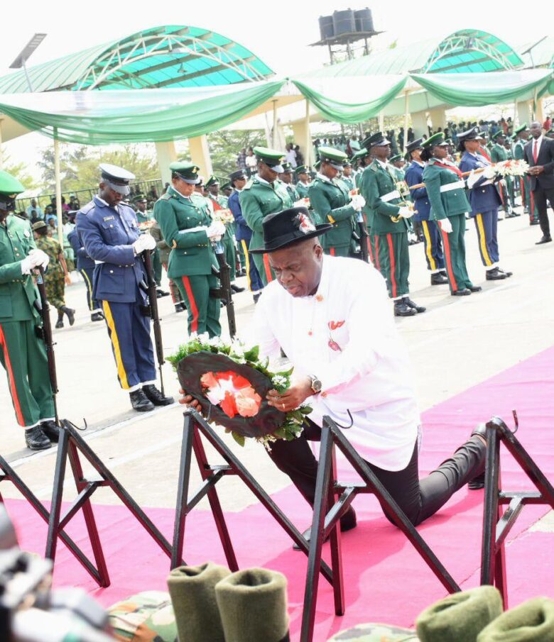 The highlight of the ceremony was the laying of wreaths at the tomb of the unknown soldier by Governor Douye Diri, his deputy, Senator Lawrence Ewhrudjakpo, Speaker, Bayelsa State House of Assembly, Rt. Hon. Abraham Ingobere, Chief Judge, Justice Matilda Ayemieye, chairman of the state traditional rulers council, King Bubaraye Dakolo, represented by his vice, King Charles Owaba, service commanders, and the widow of a fallen hero, Mrs Esther Femowei.