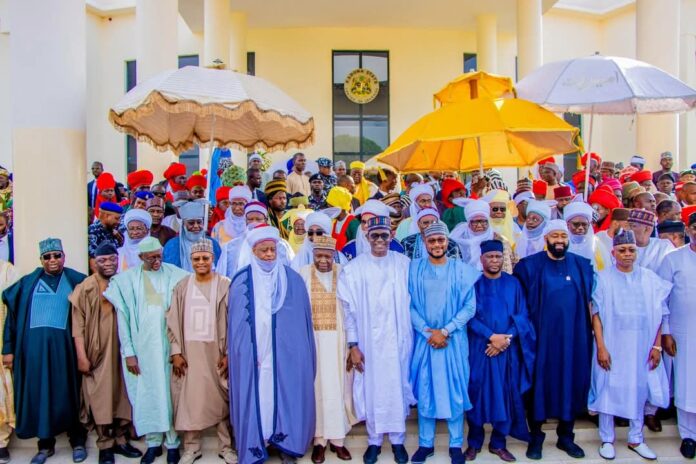 Northern governors, led by Governor Muhammadu Inuwa Yahaya of Gombe State (M), and traditional rulers, led by Sultan Sa’ad Abubakar (5th L), after a joint meeting in Kaduna.